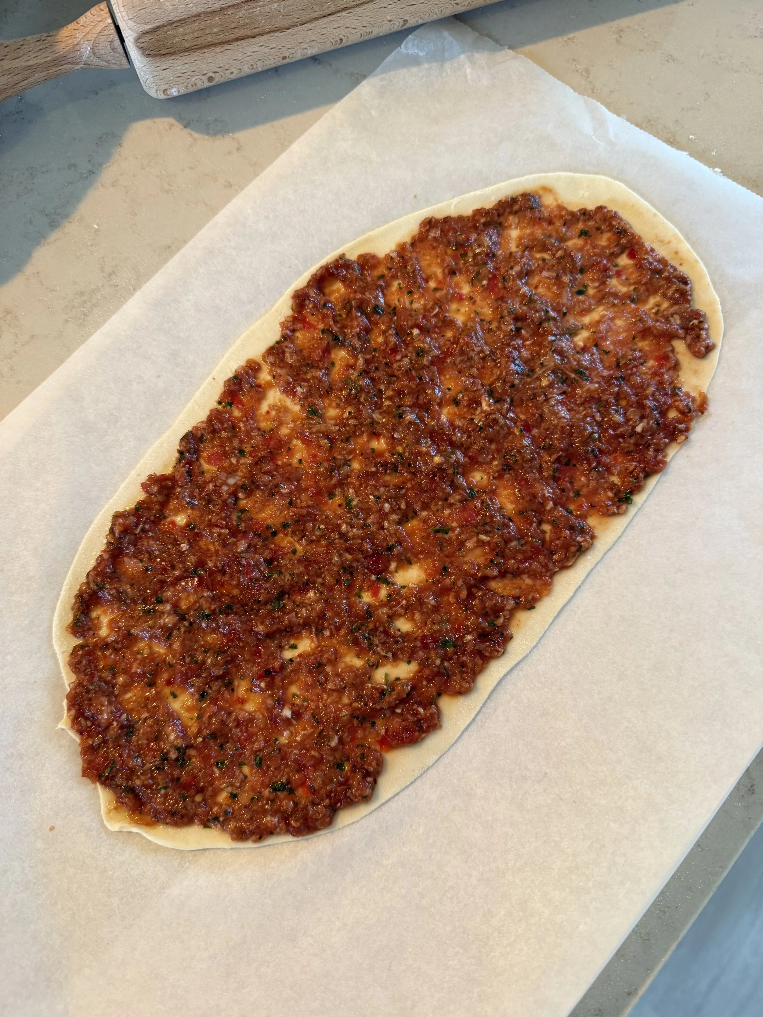 Stap 4: Verdeel het deeg in 6 gelijke bolletjes. Rol elk bolletje uit tot een dunne cirkel van ongeveer 2 mm dikte zoals op de rechterfoto. Verdeel een dunne laag topping over het deeg. Duk licht aan met je vingers. Leg de lahmacun op een hete ovenplaat met bakpapier eronder. Bak de lahmacuns 5–6 minuten, tot de randen goudbruin en krokant zijn.